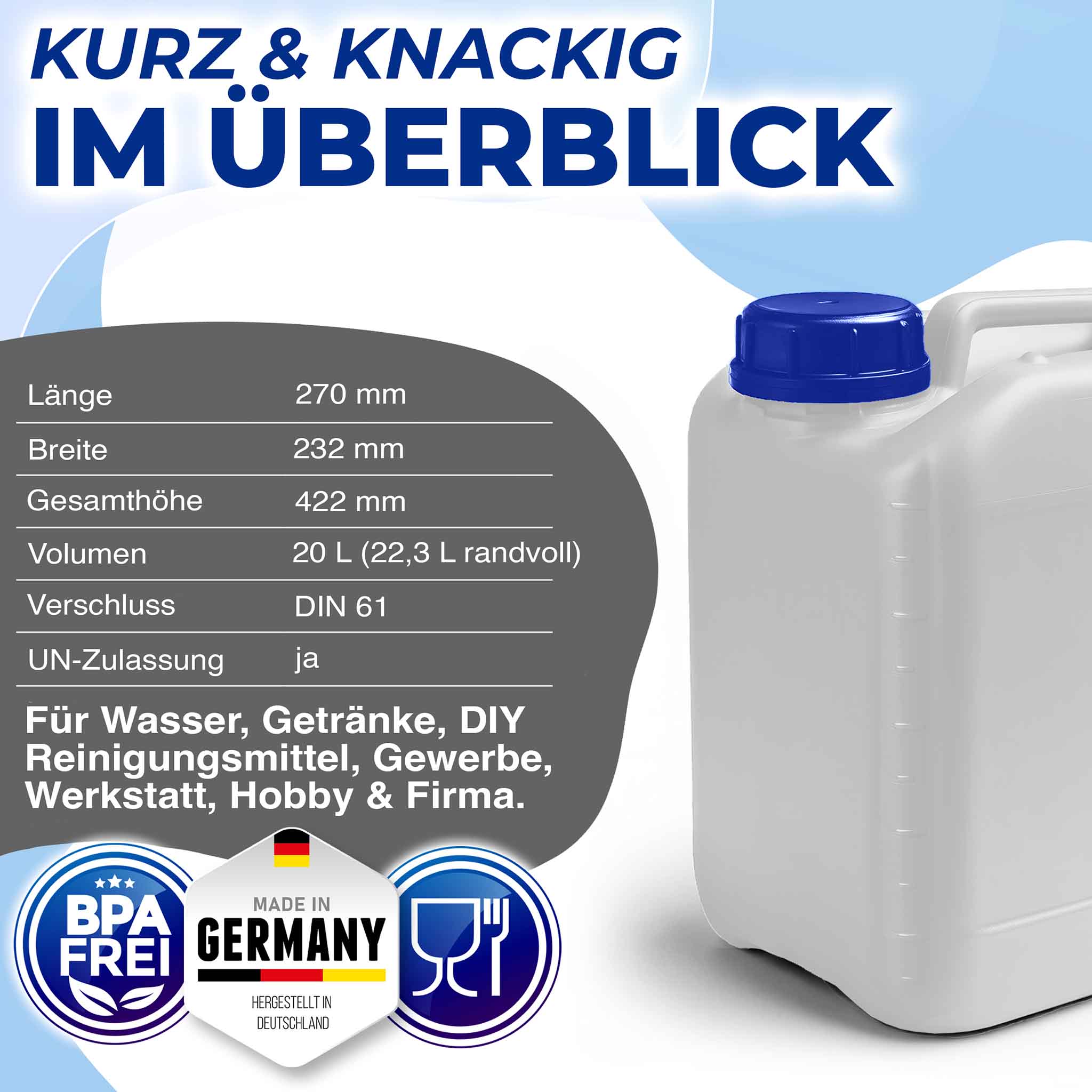 Ob im Haushalt, beim Camping, im Garten, Hobby oder Firma, die Kanister sind universell einsetzbar. Der transparente Kanister mit blauen Deckel bietet eine praktische und sichere Möglichkeit, Flüssigkeiten aufzubewahren oder zu transportieren. | Das lebensmittelechte, BPA-freie Material macht ihn besonders geeignet für Wasser sowie weitere Anwendungen im privaten und gewerblichen Bereich.